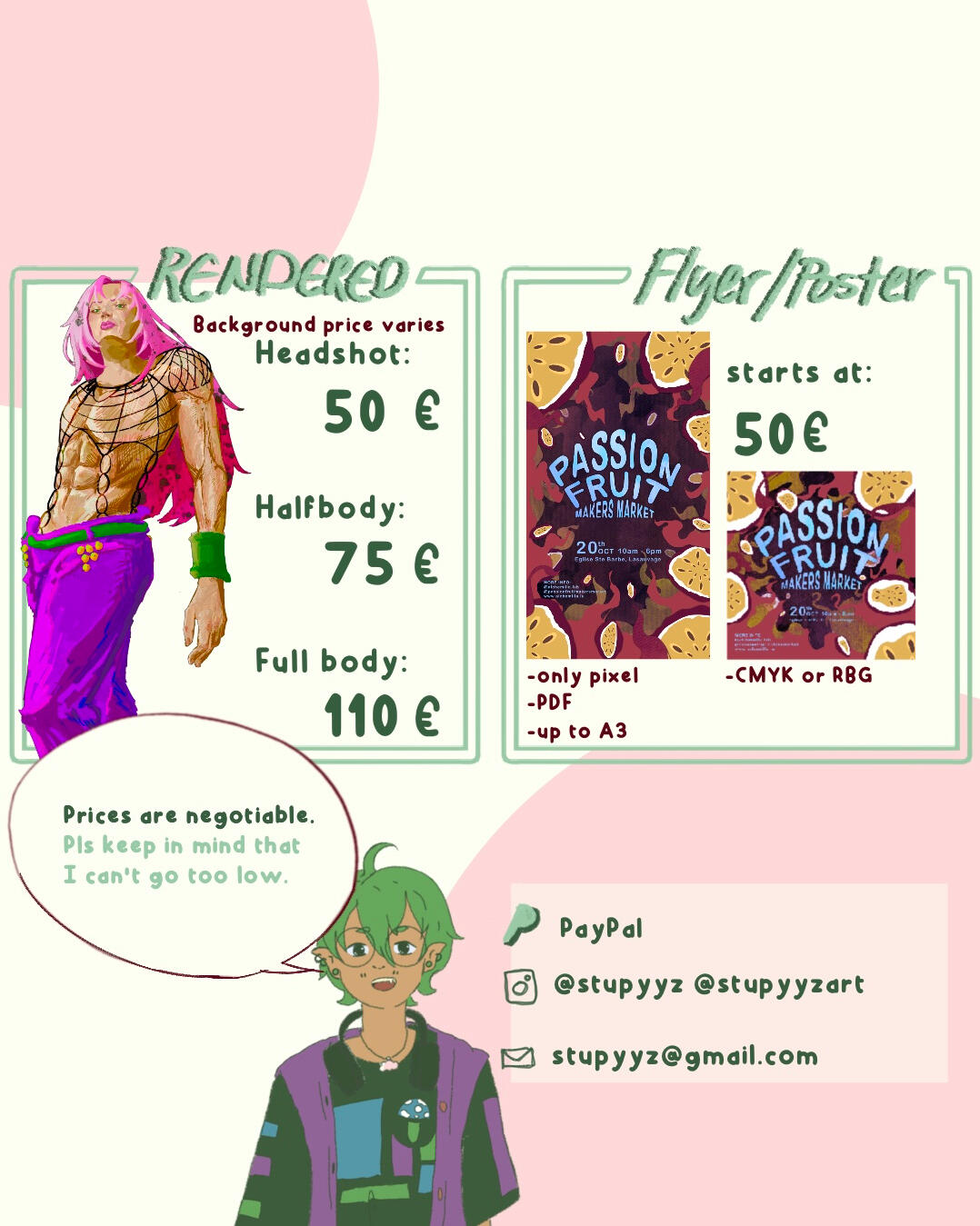 Hello! Thank you for showing interests in my commissions!♥Please read: I might change certain things (e.g. Prices, what I offer, etc.) throughout time. For Updates check this website or my IG @stupyyzart (or click on Icon below)I might take longer to finish comissions, I have exams and personal life taking priority right now. Please consider this. Thank you for reading ♥